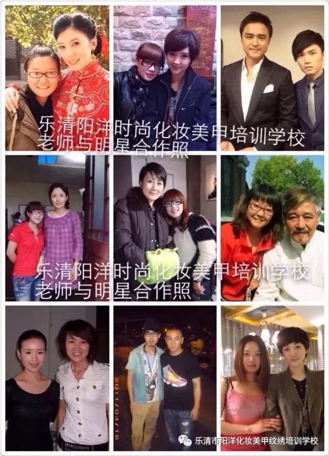 学校老师和部分明星合作的合影,老师们在剧组化各种不同类型的影视妆容,老师们的技术在行业里得到很多圈内人认可。
