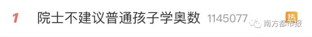 大批网友表示同意 @水心卡米 :这个观点我同意√ 奥数不是每个孩子都适合学🙈 @容姓人家出人才:很难不赞成 @奇怪太阳也不公休:专家说的太好了 挺有道理的 孩子如果没有兴趣 真的没必要让孩子学奥数 我小时候就没学 还挺好的 @安徽洪金宝:对于绝大多数人,搞奥数是没必要,搞奥数的孩子,在小时候就能发现其思维敏捷,逻辑性很强,观察能力也很强,适当体验一下,不合适就不要硬这来很多网友纷纷表示 自己小时候也学过奥数@·蜡笔独角兽:之前上的奥数班真的太痛苦了 @LING_HINShhh:我觉得还是有道理的,记得我五年级的时候被数学老师抓去上奥数班,我简直就一脸懵@伽椰子孖孨:985毕业生还记得当初是个大学生的时候给小学表弟辅导数学看到奥数的崩溃……@limelightzoo:实在人,实在话👍🏻你们的孩子学了吗?有人表示不要给孩子太大压力应尊重孩子的兴趣爱好@退役熬夜選手阿:我觉得还是不要给孩子太大的压力 @吾本嘉人vic:不管是奥数还是其他的,都应该尊重孩子的兴趣才对。 @山鬼小半仙:小孩子还是学点有兴趣的吧,小朋友有灵气比较重要! @CLORIS的小短裙:才各有长吧 或许在奥数上没天赋 但在其他方面却是难得的人才 感觉学习自己所长 做自己所喜或许更好@星星点点光光亮堂堂:学一学拓展思维是可以的,明白自己在什么水平,犯不上自卑也没必要自负@奶盖先森_ :有兴趣的可以钻研 没兴趣的真的没太多必要 如果是说锻炼逻辑的话 普通数学也可以……也有网友指出一个问题@喜欢 喝雪碧的啊肆:可是你说这个普通孩子又该如何定义,没有多少人愿意说自己孩子普通。@宅数码Kael:很多家长都不认为自己孩子是普通孩子@面团肉肉:但是小时候我妈误认为我天赋异禀很难普通 @一个特别爱吃海底捞的大学生:主要是家长觉得自己孩子不普通啊!我明明那么普通 我妈却对我那么自信 对此,你怎么看?来源| 南方都市报(nddaily)综合 @科技日报(记者 陆成宽)、@中国之声