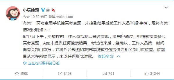 6月8日上午,针对该事件,小猿搜题回应称:App未提供任何搜索结果,考试结束后,经确认,工作人员第一时间向有关部门举报,并将后台截图和数据等线索打包提供给相关部门供核查。该题目从未在前端显示,未以任何形式泄露。