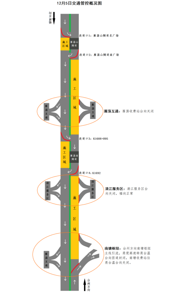 ①往台州方向南塘收费站、雁荡收费站关闭;