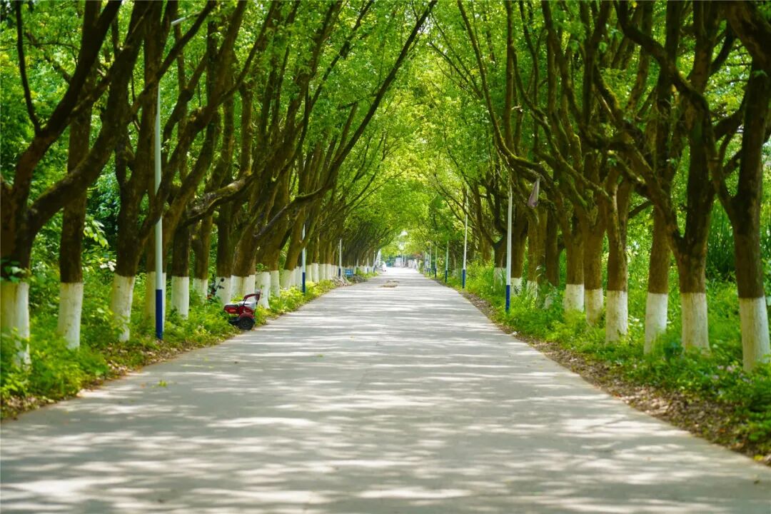 仰视过花海,继续前行,凤凰山入口处的道路笔直直通凤凰山脚,这条数百米长的绿荫小道,一直为人乐道。道路两侧绿树合拢成荫,阳光透过树叶洒落地面,风吹拂面,十分怡人。