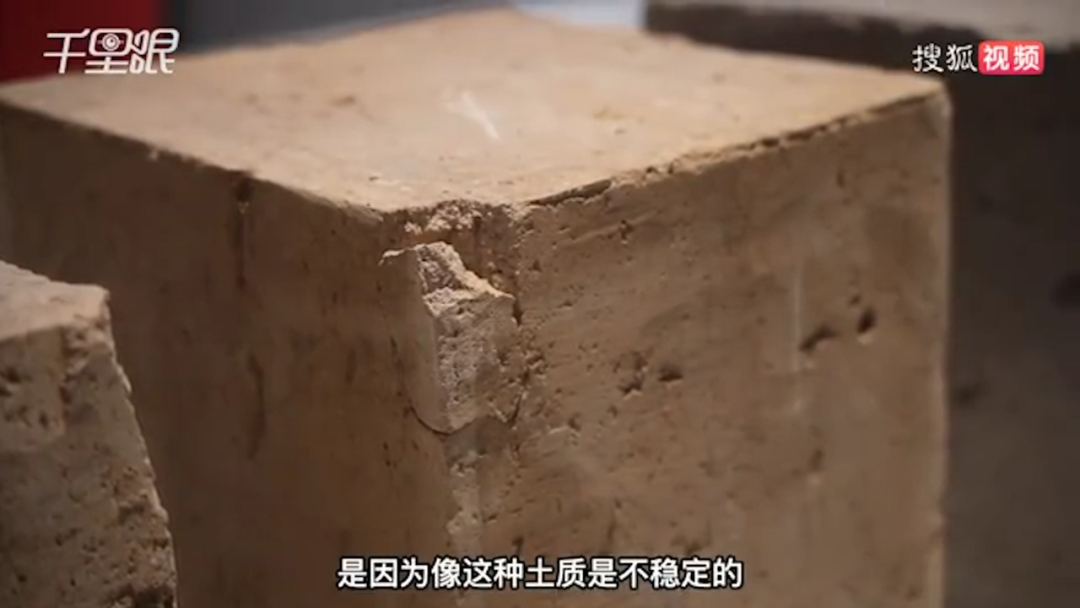 从网友发布的图片中可以看到,考古博物馆一楼展厅内陈列着一些切成立方体的土块,土块上存在明显的缺角、开裂以及人为划痕。