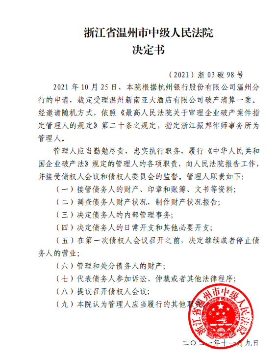 温州新南亚大酒店有限公司重整投资人资格将在20天后正式拍卖,起拍价1.53亿元。