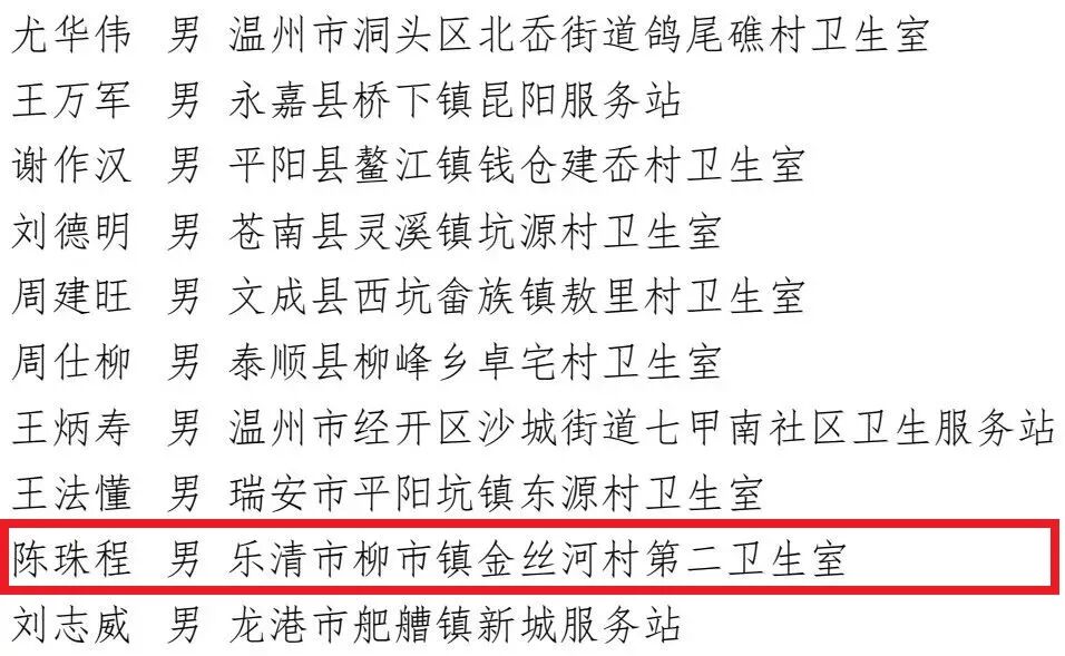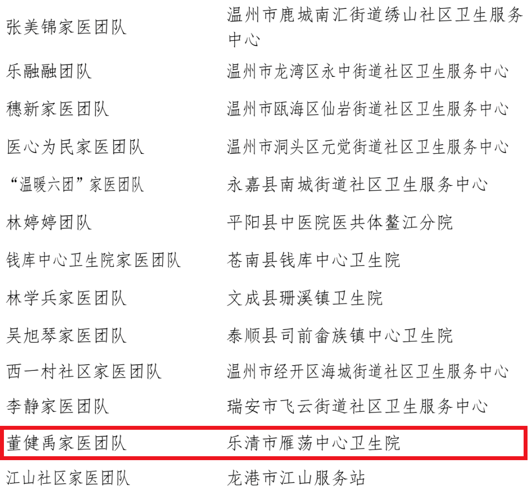 其中,乐清市雁荡中心卫生院董健禹家医团队荣获2022年浙江省“家医党员先锋团队”称号,乐清市白石街道社区卫生服务中心梁贤东荣获2022年浙江省“优秀家庭医生”称号,乐清市柳市镇金丝河村第二卫生室陈珠程荣获2022年浙江省“优秀乡村医生”称号