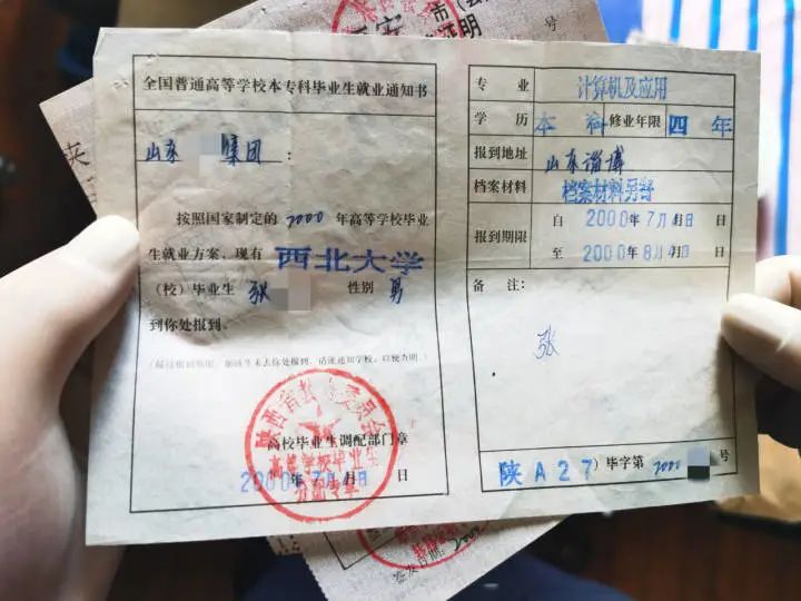 通知书上写着:山东某某集团:按照国家制定的2000年高等学校毕业生就业方案,现有西北大学(校)毕业生张某某性别男到你处报到。底下还盖着红戳戳的“陕西省教育委员会高等学校毕业生分配专章”。落款是2000年7月4日。