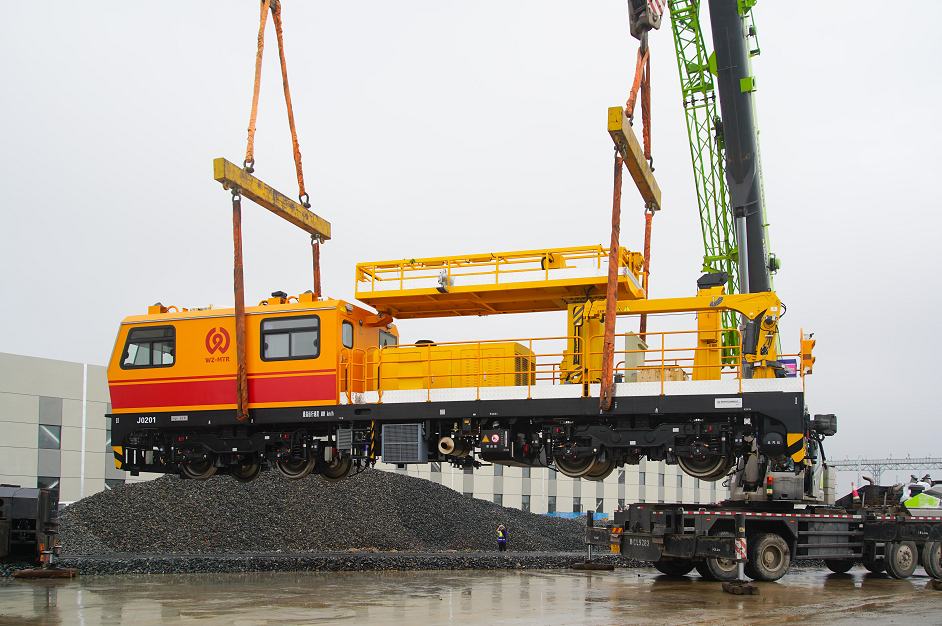 6月2日上午8点左右,接车正式开始。在两台百吨吊车的精准“发力”下,“头”戴大红花、通体“工程黄”的工程车被稳稳吊至空中,随后被平缓地放置在S2线轨道上的指定位置,工程车同时还发出嘹亮的鸣笛声。