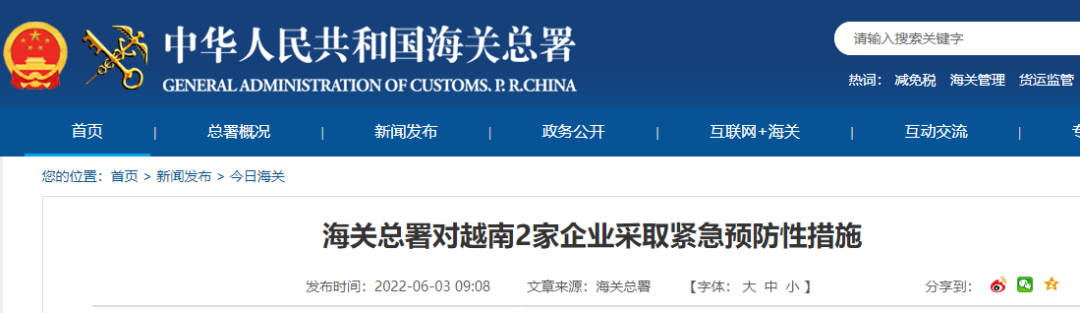 海关总署对越南2家企业采取紧急预防性措施