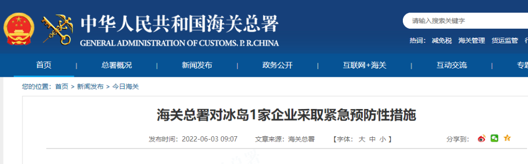 海关总署对冰岛1家企业采取紧急预防性措施