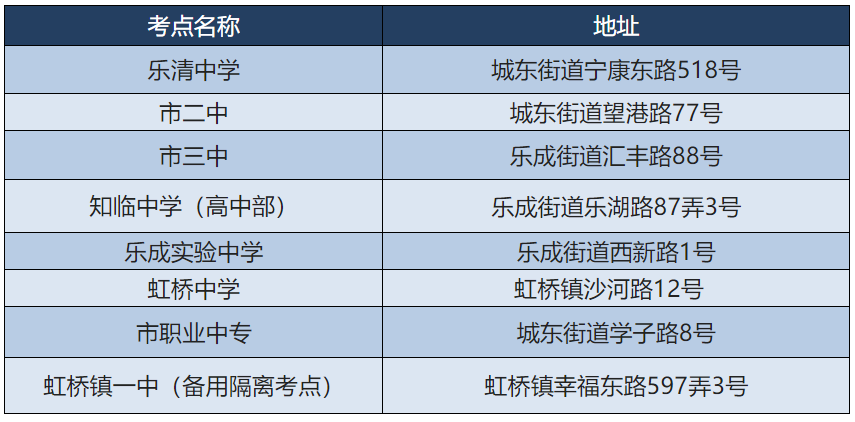 考场安排 乐清设有考点7个,考场共计1544个,其中市区设6个考点,虹桥镇设1个考点。与往年不同的是,今年还设了1个备用隔离考点,虹桥镇一中为乐清考区备用隔离考点。 据了解,目前,各考点已全部落实防疫硬件,设立医疗防治站、体温检测点,配齐了防疫物资,还设置了发热隔离考场、隔离区域和专用通道等。 周边交通管制 高考期间,为给莘莘学子营造一个安静、舒适的考试环境,交警部门将在考点周边道路实施交通严管,请广大市民通过考点周边道路时积极配合。如果考生或考生家长遇到紧急交通情况,可以拨打乐清交警求助热线:0577-62591122。