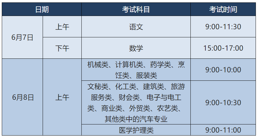 2022年浙江省单独考试招生文化考试 科目与时间表