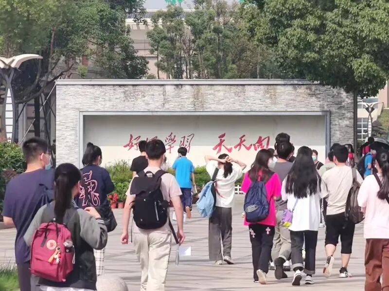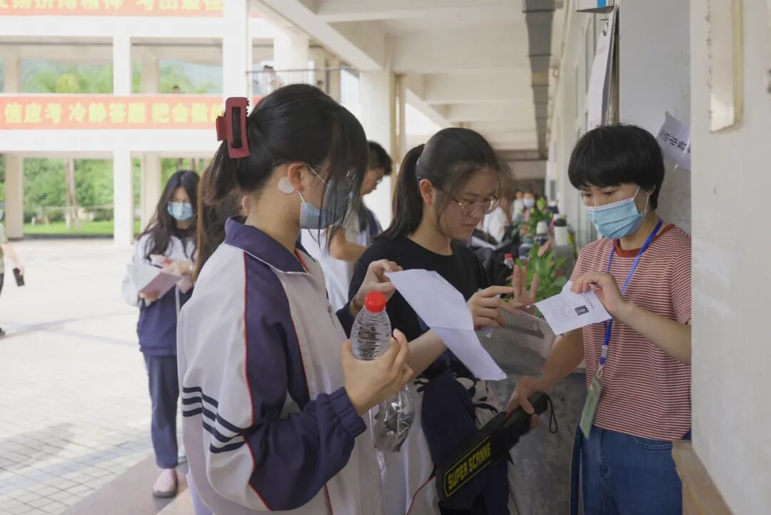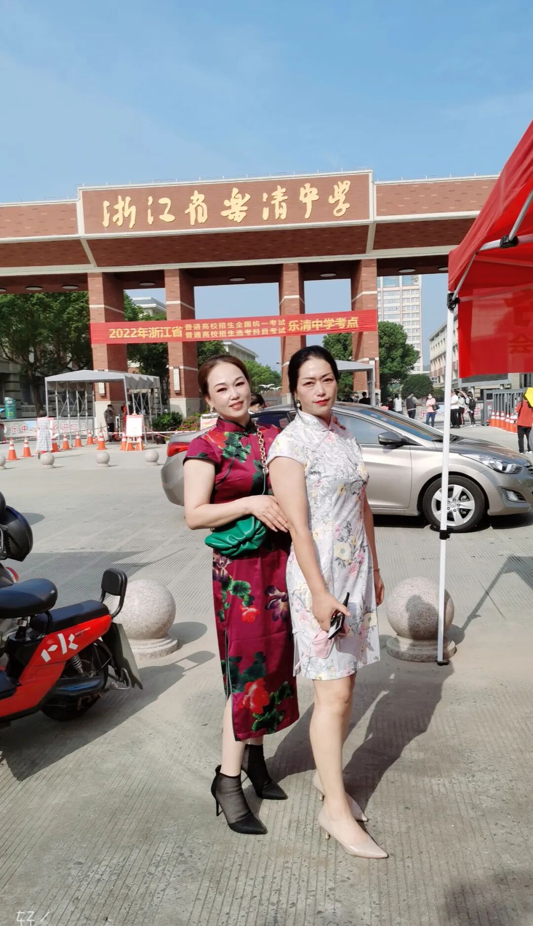 △乐清中学考点外,两位送考家长特意穿上旗袍,希望孩子能够旗开得胜、一举夺魁。