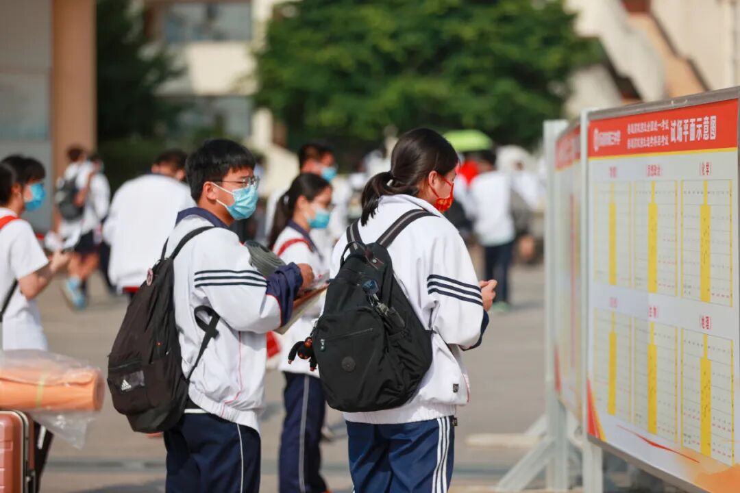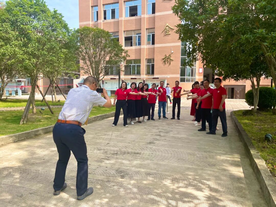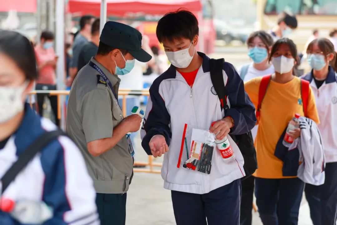 △高考首日,虹桥中学的校长和老师们身着红色短袖为考生加油,祝考生旗开得胜。
