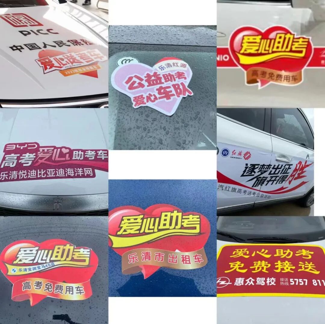△看到这些爱心车贴的标志,学生都可以招手,凭准考证免费乘坐。