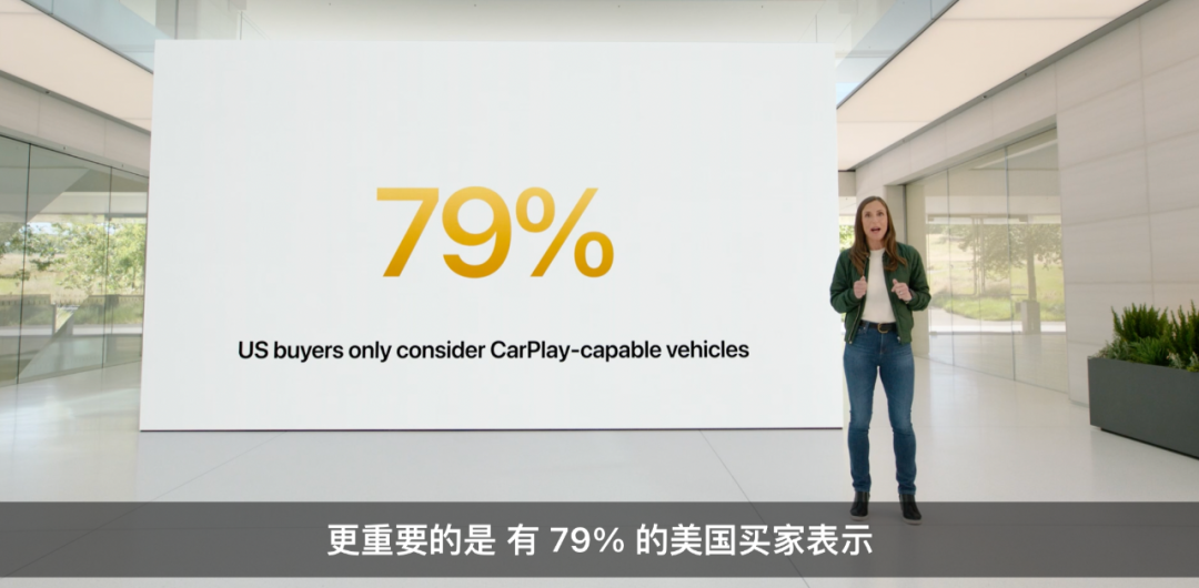 苹果表示,美国98%的车都可以使用CarPlay,79%的美国消费者表示自己只会买支持CarPlay的汽车。
