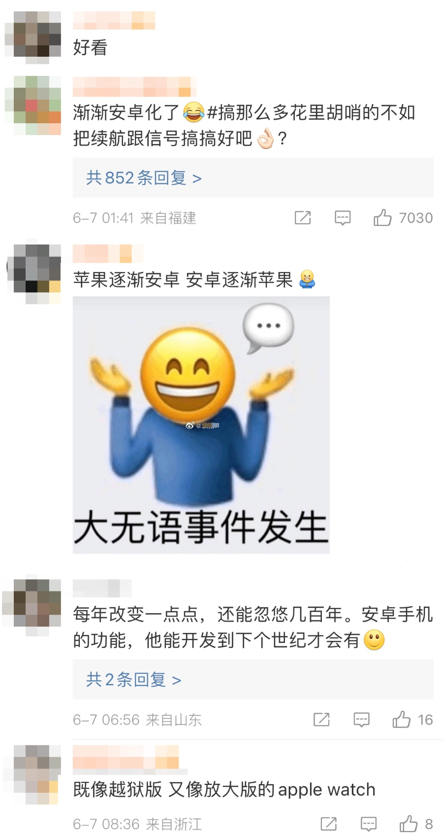 苹果表示,这是“史上最大”锁屏升级。但从网友的反响来看,有人夸“好看”,也有人说“越改越像安卓了”。
