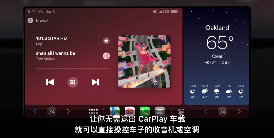 与以前的苹果CarPlay版本相比,新的软件将能够更深入地连接到核心驾驶系统。借助下一代CarPlay,驾驶员无需离开CarPlay界面,即可更改车内的温度设置、使用有声读物、收听收看新闻、播客等应用程序等。苹果称,将以“隐私友好的方式”与车辆系统实时通信,以显示速度、油位和温度等驾驶信息。