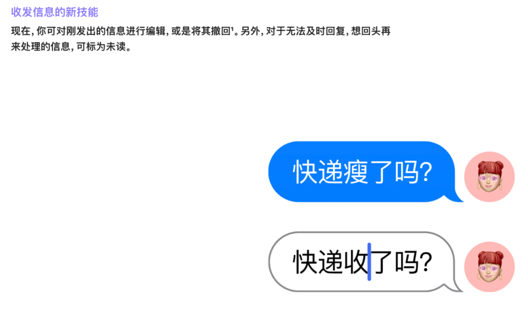 苹果称,用户可以编辑或撤回刚刚发送的信息,恢复最近删除的信息,还可将对话标记为未读,留待晚些时候再来处理。