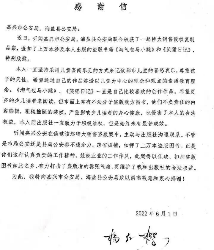 6月1日,丛书的出版社、《淘气包马小跳》的作者杨红樱得知警方破案后,分别写来感谢信。