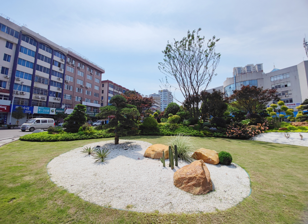 在新光环岛,往日杂乱的绿化景观不见了,取而代之的是造型各异的假山石、绿意连绵的草树、色彩鲜艳的时令花卉。绿化整洁有序,衬托得其中的“柳市”电气概念雕塑更为醒目,让人眼前一亮。