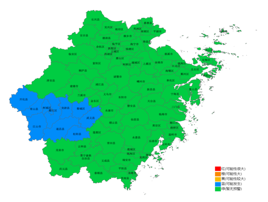 预计9日20时至10日20时,婺城区、武义县、柯城区、衢江区、常山县、开化县、龙游县、江山市、遂昌县、松阳县可能发生山洪灾害(蓝色预警)。请密切关注天气形势及雨水情变化,注意防范强降水引发的山洪灾害。