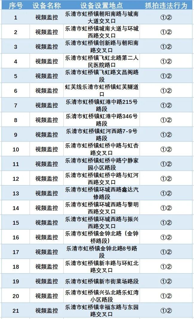 为进一步加强道路交通安全管理,乐清市公安机关交通管理部门新增了101处固定式交通技术监控设备,将于2022年6月16日启用。启用后将对①“驾驶机动车不按规定临时停车影响其他车辆和行人通行的”;②“机动车不按停车泊位标识方向停放的”等行为进行抓拍。