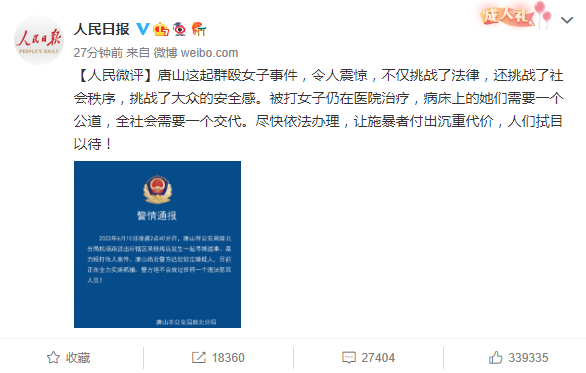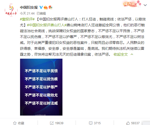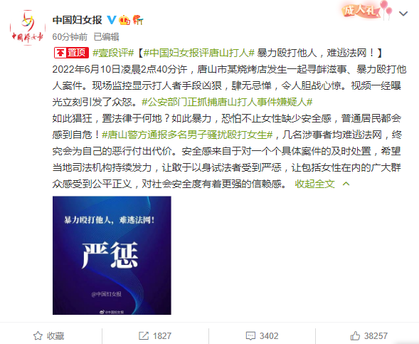 唐山烧烤店打人狂徒激起全网公愤,他们的恶行触碰法治社会底线,挑战保障妇女权益的国家意志,不严惩不足以平民愤,不严惩不足以抚伤痕,不严惩不足以护尊严,不严惩不足以儆效尤,不严惩不足以树法威。对于此类严重侵犯妇女权益的恶性案件,只能而且必须零容忍。人民群众的获得感、幸福感、安全感,安全感是基础,是底线。我们期待执法机关继续以雷霆之势,尽快将这帮无法无天的狂徒缉拿归案,依法严惩。