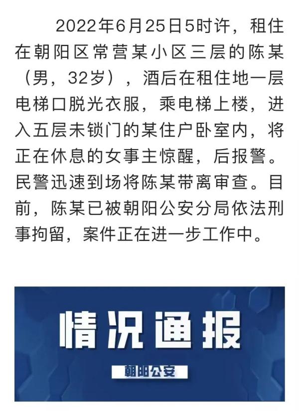 北京市公安局朝阳分局刚刚通报,2022年6月25日5时许,租住在朝阳区常营某小区三层的陈某(男,32岁),酒后在租住地一层电梯口脱光衣服,乘电梯上楼,进入五层未锁门的某住户卧室内,将正在休息的女事主惊醒,后报警。民警迅速到场将陈某带离审查。