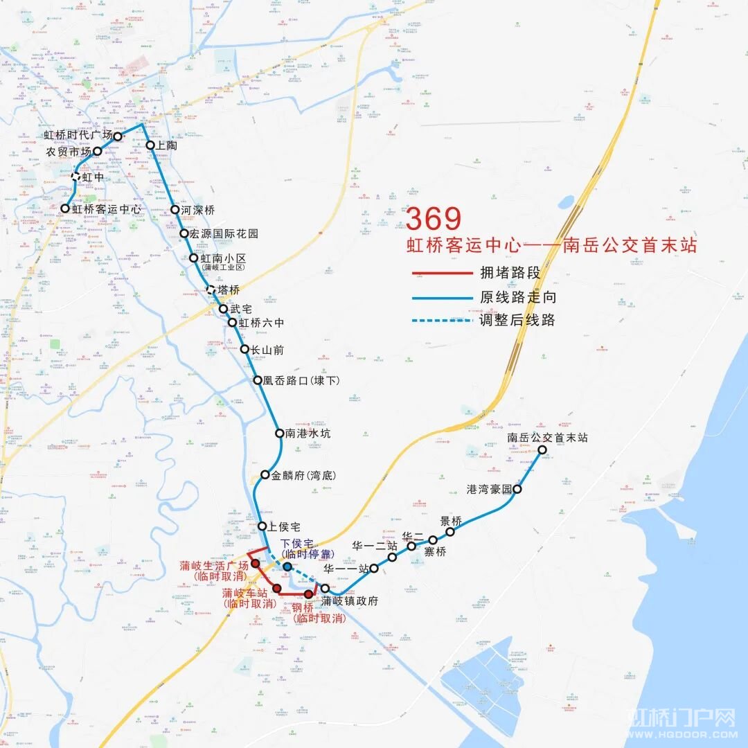 上行:虹桥客运中心—农贸市场—虹桥时代广场—上陶—河深桥—宏源国际花园—虹南小区—塔桥—武宅—虹桥六中—长山前—埭下—南港水坑—金麟府(湾底)—上侯宅—下侯宅(临时停靠)—蒲岐镇政府—华一一站—华一二站—华二—寨桥—景桥—港湾豪园—南岳公交首末站