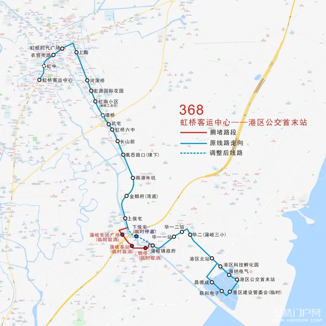 下行:港区公交首末站—联和电子—昌德成—港区科技孵化园—港区北站—华二(蒲岐三小)—华一二站—华一一站—蒲岐镇政府—下侯宅(临时停靠)—上侯宅—金麟府(湾底)—南港水坑—凰岙路口—长山前—虹桥六中—武宅—蒲岐工业区—宏源国际花园—河深桥—上陶—虹桥时代广场—农贸市场—虹中—虹桥客运中心