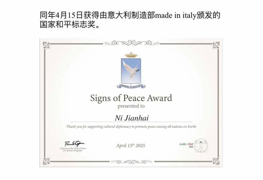 这个奖是意大利国家级国际文化艺术奖,评审阵容超强。倪建海深耕艺术多年,还曾获意大利国家和平标志奖,这次获奖后他说会继续创作,让经典艺术在当代焕新