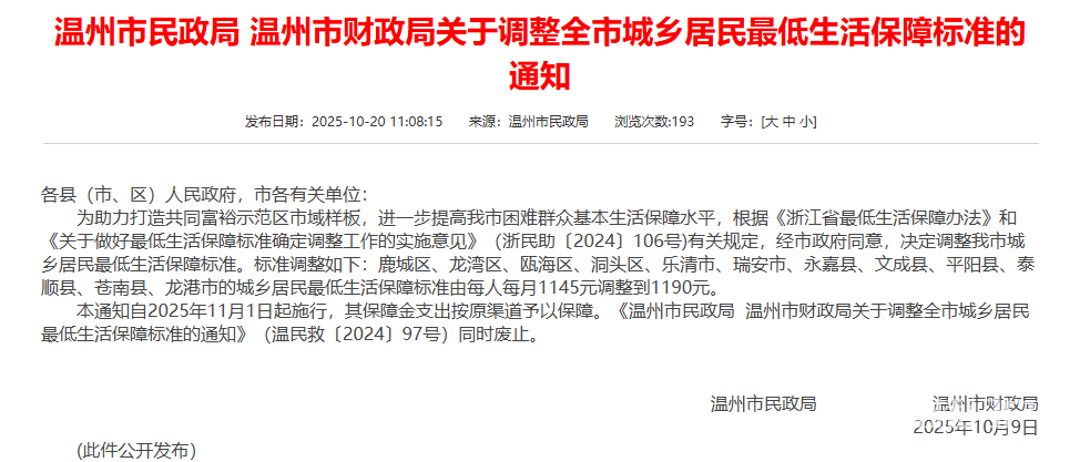 刚刷到乐清发布的通知,咱们温州全域(包括乐清)的城乡居民低保标准上调了!从之前每人每月 1145 元,调到 1190 元,每月能多领 45 块呢~