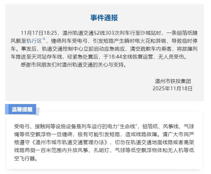 昨晚温州 S2 线临时停车?真相来了:铝箔纸飘进轨行区导致短路,还好处置及时,18:44 就恢复运营了,安全第一!