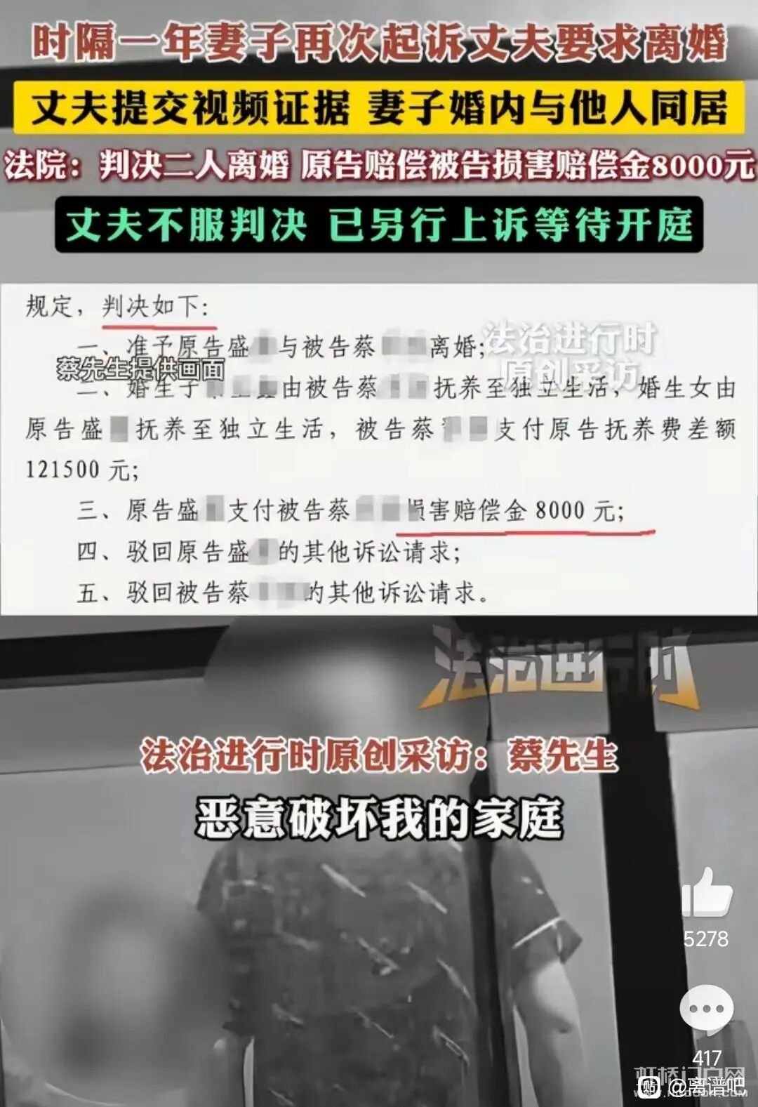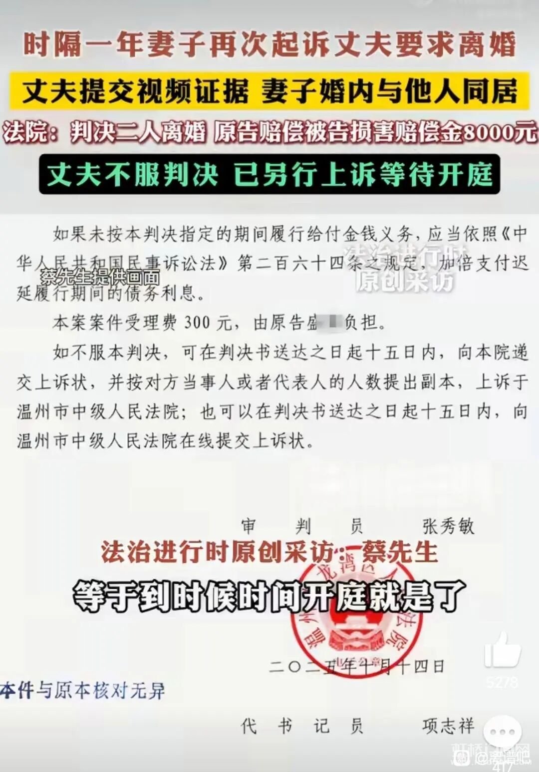 [周边民情]温州女子和他人同居,老公获赔8000元 [复制链接]