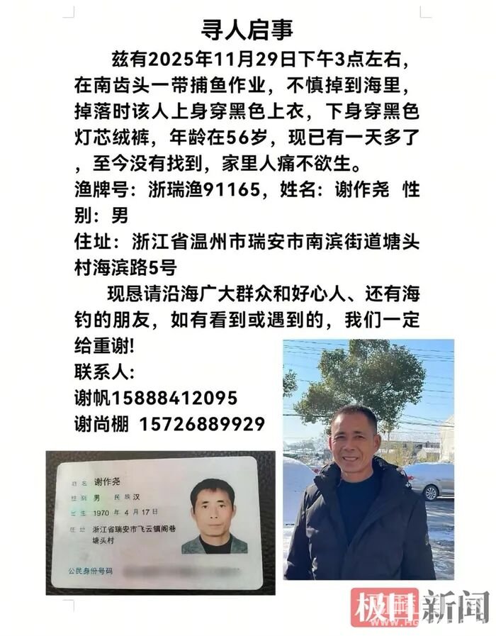 温州瑞安 55 岁渔民大伯,11 月 29 日下午在南齿头海域独自捕鱼时失联!