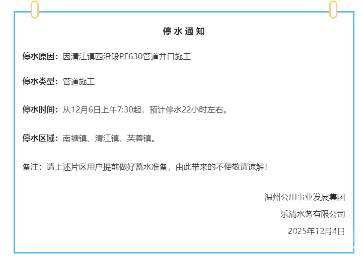 【停水通知】22小时!乐清停水通知,涉及多个乡镇