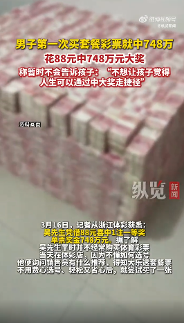 浙江有位吴先生花 88 元买体彩套餐票喜中大奖,却选择暂时瞒着两个孩子,不想让他们觉得人生可以走捷径,只想用奖金改善生活、规划孩子教育。